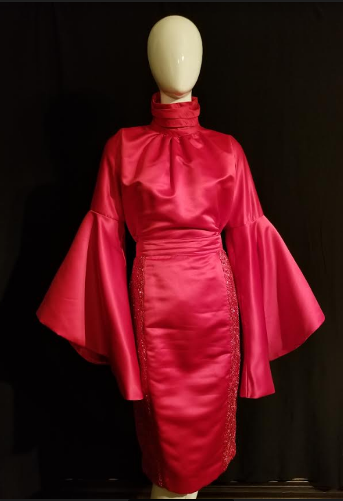 Set-red trumpet sleeve blouse pleated collar 3 buttons at back back and pencil skirt with red spider sequence over lay sequence sewn on side of skirt. Shirt is lined & zipper in back.