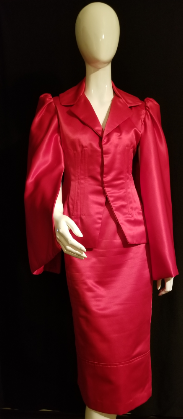 2-Piece Set- Jacket invisible hooks for front closure, long sleeves open under arm for cape effect, several fisheye pleated at the waistline front & back with boning at mid waistline, linned.
